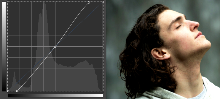Vill du öka kontrasten mellan ljusa och mörka partier kan du klicka ut var sin punkt halvvägs mellan mitten och hörnen. Dra sedan den övre uppåt och den nedre nedåt så gör du mörkt mörkare och ljust ljusare, och kurvan ser nu ut som ett svagt S.