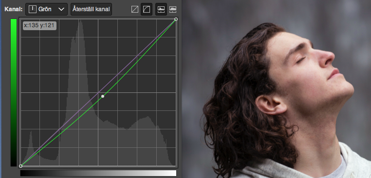 Är ansikten för blå- eller gröntonade? Kanske kan du med kurvan för rött dra mellantoner lite uppåt vänster för att värma upp bilden, eller göra en allmän justering med bara en punkt mitt i den gröna kurvan och ta den nedåt höger.